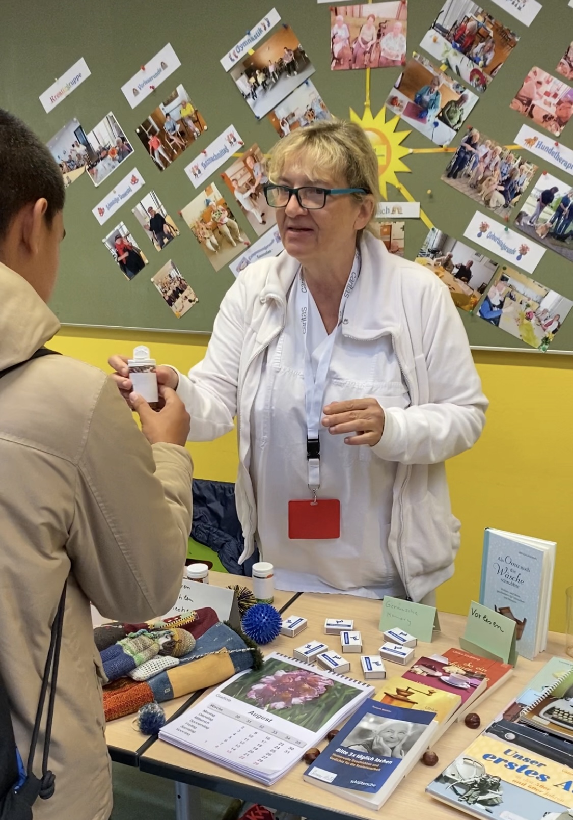 „Uns war es wichtig, die Vielseitigkeit der Arbeit in der Pflege für die Jugendlichen erfahrbar zu machen, denn wir bieten eine Rund-um-die-Uhr-Betreuung für alte pflegebedürftige Menschen an, da gehören Pflege und Betreuung genauso dazu wie Hauswirtschaft und Küche“, erklärte Martha Trautwein, Einrichtungsleitung des Caritas Altenzentrums Sancta Maria in Plankstadt. So erfuhren die Jugendlichen am Caritas-Stand nicht nur viel über die Pflege, sondern auch über die Tätigkeit der Betreuung und erhielten Hintergrundwissen zu altersbedingten Krankheiten.