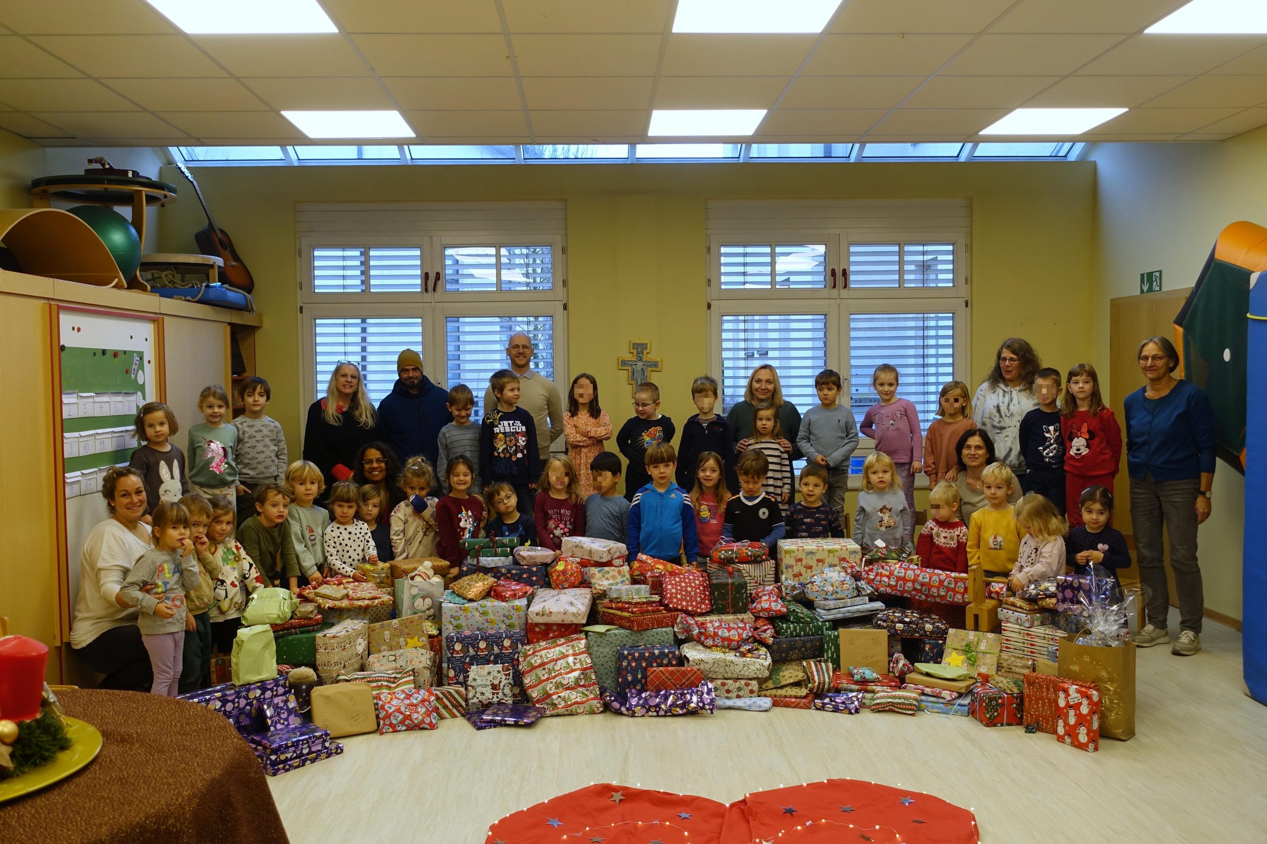 Rund 200 Weihnachtsgeschenke haben die Kinder des katholischen Kindergartens / Familienzentrums St. Nikolaus in Rettigheim mit ihren Familien für andere Kinder gepackt. Pünktlich zum Fest können die Präsente nun über die Tafel Schwetzingen „Appel+Ei“ und die Caritas-Beratungsdienste in Schwetzingen und Wiesloch an Kinder aus der Region verteilt werden, die sonst womöglich kein Weihnachtsgeschenk bekommen würden.