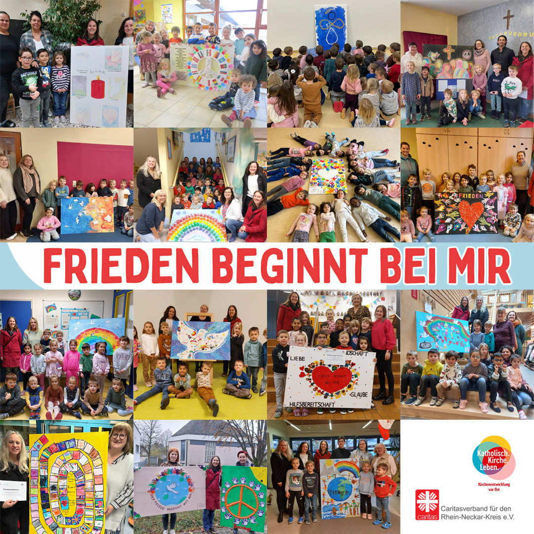 Zum Motto der diesjährigen Caritas-Kampagne „Frieden beginnt bei mir“ hat der Caritasverband für den Rhein-Neckar-Kreis e.V. in Kooperation mit der Kirchenentwicklung vor Ort eine Mitmach-Kunstaktion für Kinder veranstaltet. Alle Kindergärten der künftigen röm.-kath. Kirchengemeinde Mittlere Kurpfalz waren herzlich eingeladen, eine große Leinwand gemeinschaftlich zum Thema Frieden zu gestalten.