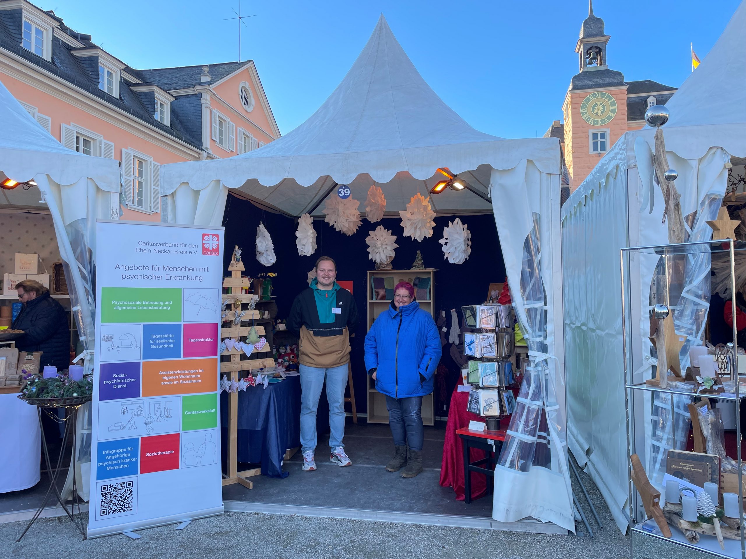 Am ersten Adventswochenende haben bei sonnigem Winterwetter Mitarbeiter*innen der Tagesstruktur und der Caritaswerkstatt für psychisch erkrankte Menschen auf den Weihnachtsmärkten in Schwetzingen bzw. in Weinheim wieder selbst hergestellte Artikel zum Verkauf angeboten.