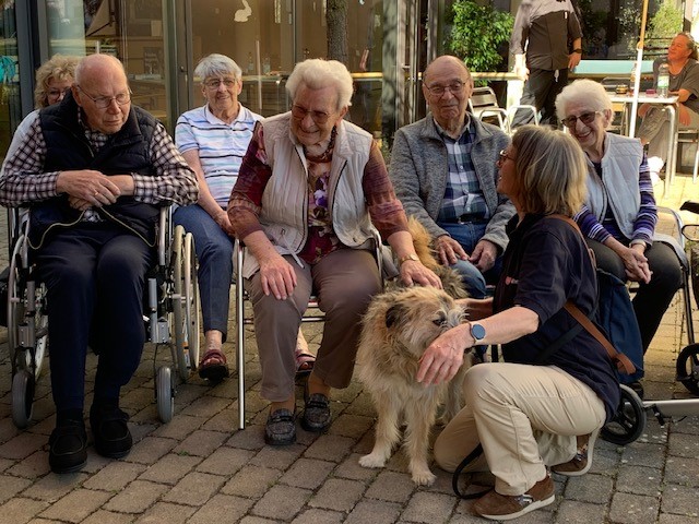 Bei diesem Besuch durften sie die Hunde schon mal kennenlernen und die Vierbeiner sorgten für sichtliche Freude, als sie so durch die Reihen der Bewohner*innen liefen und sich etliche Streicheleinheiten abholten. Die Hunde waren sehr entspannt und es war eine willkommene Abwechslung für beide Seiten. Frau Klinger, eine 87-Bewohnerin des Altenzentrums, erzählte von ihrem Hund, den sie leider auf der Flucht in den Westen damals zurücklassen musste. Sie trägt aber immer noch ein Bild bei sich, das sie auch stolz zeigte, auf dem sie mit dem Hund zu sehen ist. Sie freut sich schon sehr auf die Besuchstage mit den Hunden.
