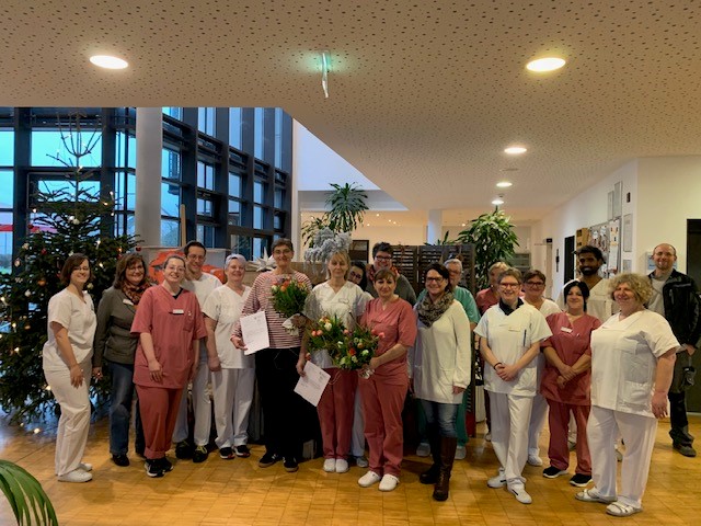 Katrin Richter ist bereits seit 30 Jahren in der Küche und im Service tätig. Zeitweise war sie auch am Empfang eingesetzt. In der Hauptsache versorgt Frau Richter jedoch mit ihrer offenen, herzlichen Art seit langem die Gäste in der hauseigenen Cafeteria. Frau Trautwein betonte ihre Zuverlässigkeit und ihre Freundlichkeit sowie ihre Fähigkeit jeden Gast mit einem Lächeln willkommen zu heißen. Leider konnte Frau Richter an der Jubiläumsfeier nicht teilnehmen. Das Küchenteam nahm in Vertretung den Blumenstrauß in Empfang.